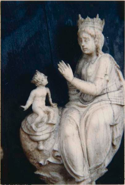 Panneau de dévotion. Fond et cadre en bois à décor brodé, applications d'ivoire.