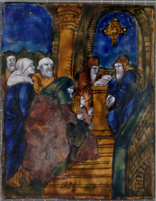 Plaque faisant partie du panneau central d'un triptyque formé de 32 panneaux d'émail peint.
