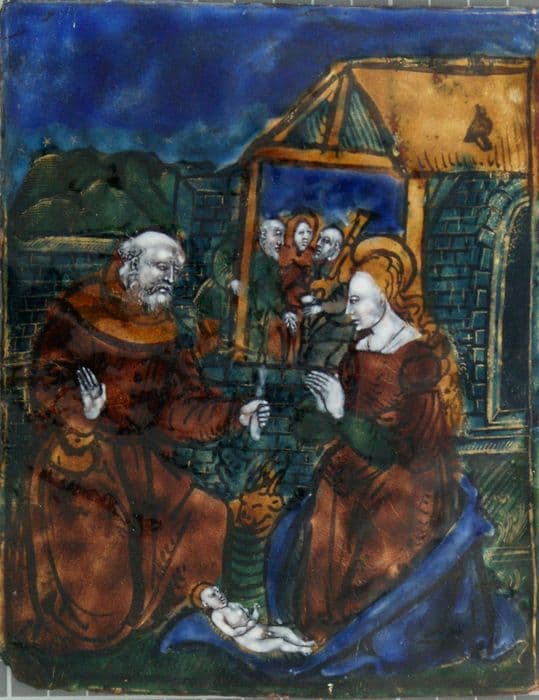 Plaque faisant partie du panneau central d'un triptyque formé de 32 panneaux d'émail peint.