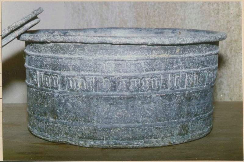 Fonts baptismaux en granite, bassin et son couvercle en plomb.