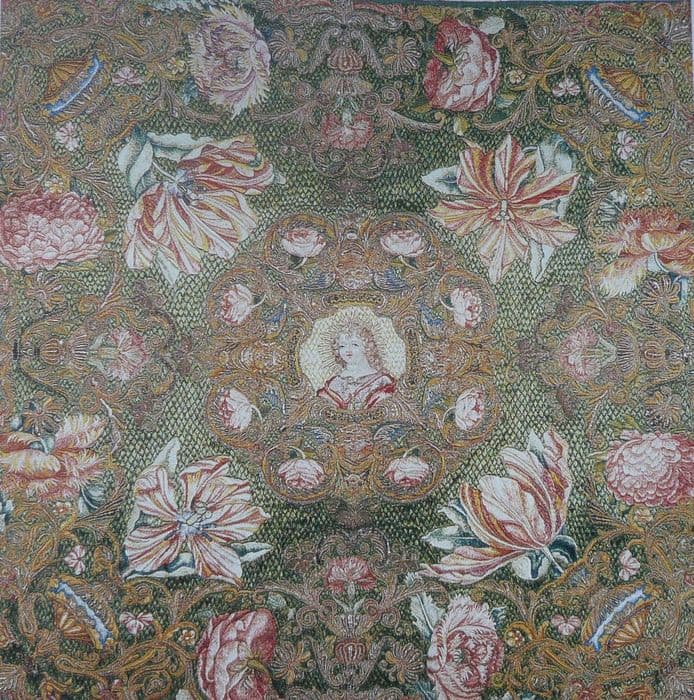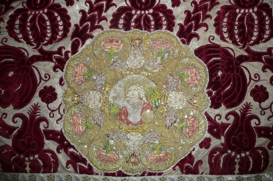 Broderie, tissu, soie, velours façonné, application sur textile, drap d'argent. Médaillon brodé.