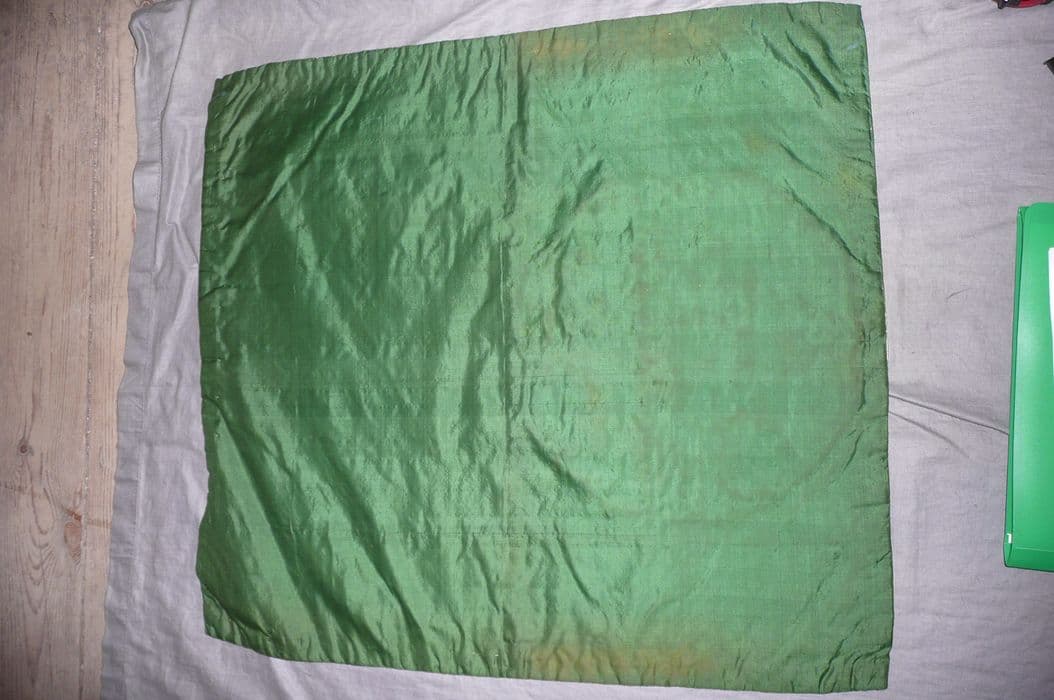 tissu uni ; soie (rouge) : brodé ; fil métal : or ; fil métal : argent