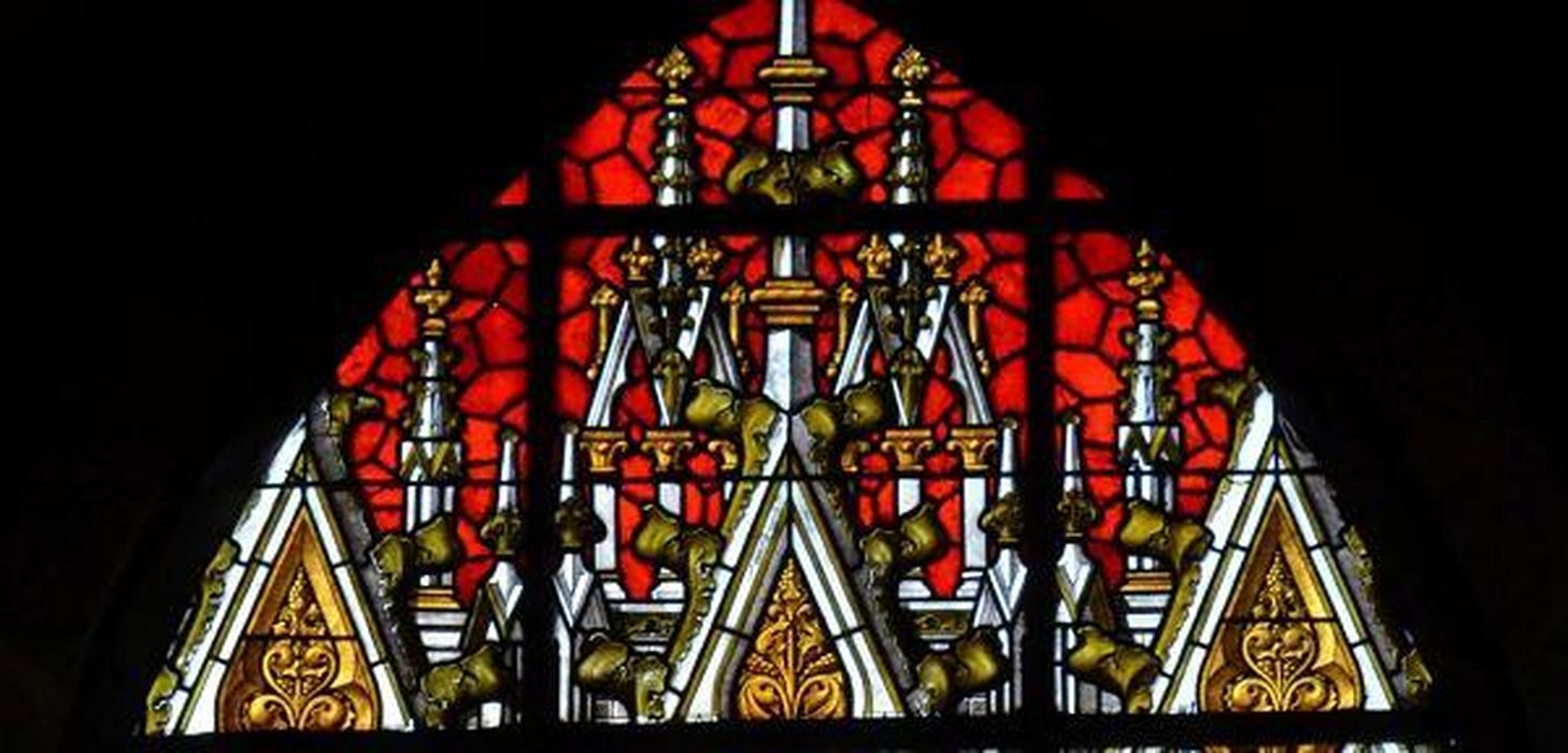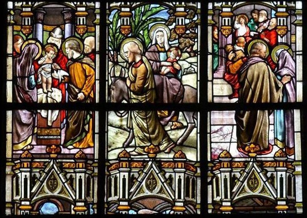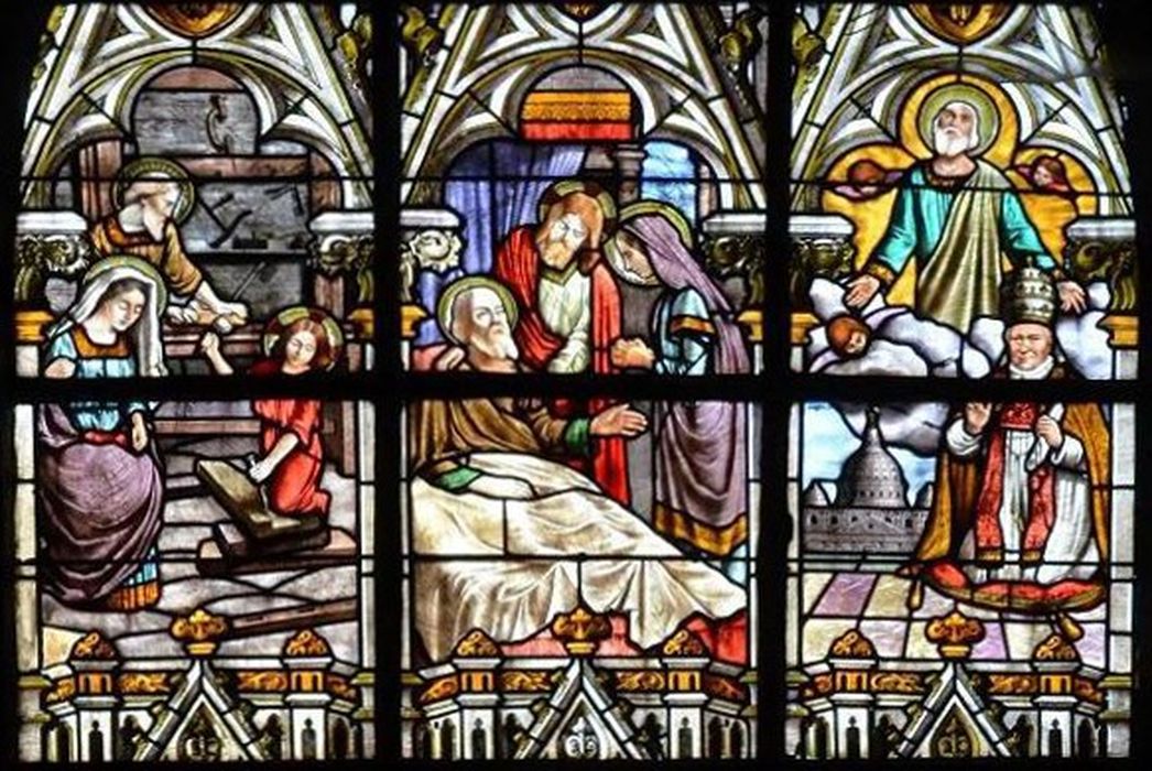 Cette verrière représente neuf scènes de la vie de saint Joseph.