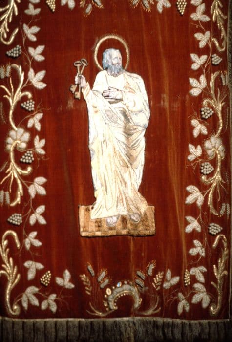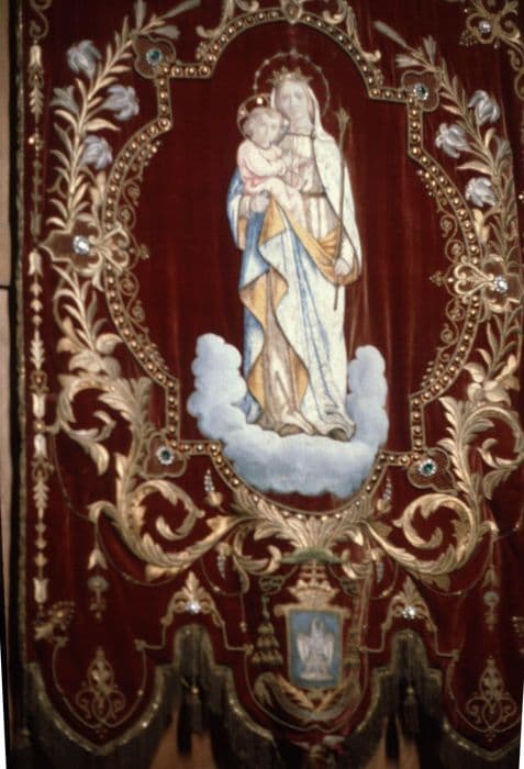 L'une des bannières représente l'Assomption et saint Pierre, l'autre la Vierge à l'Enfant et saint Pierre.