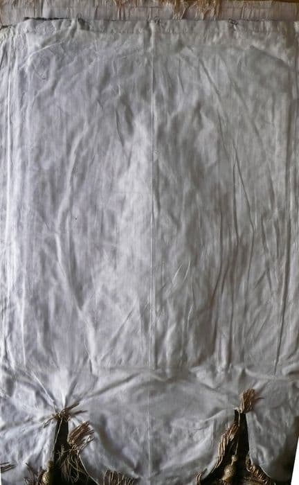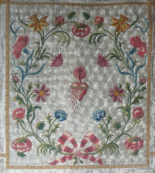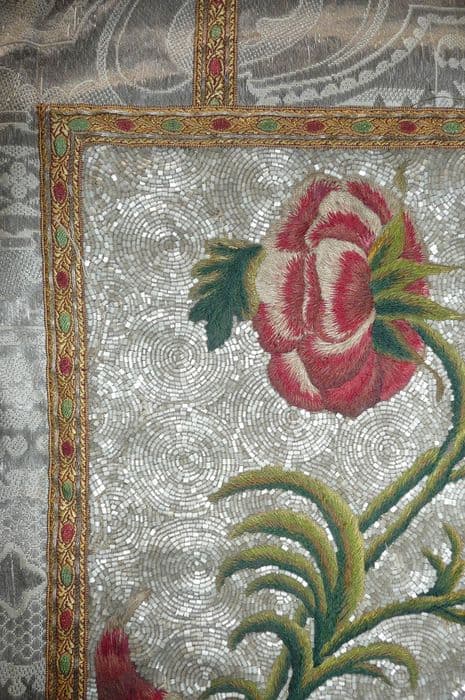 soie (blanc) : brodé, adjonction de perle, fil métal (or)