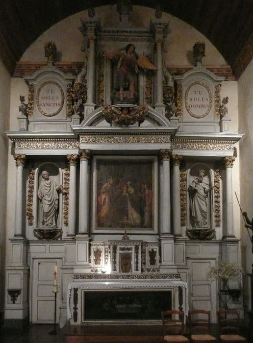 autel (maître-autel), son retable, ses trois statues : Saint Michel, Saint Pierre, Saint Paul et son tableau : Présentation au temple