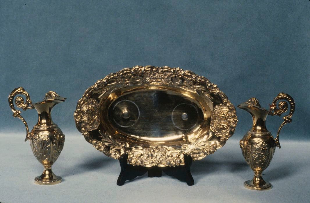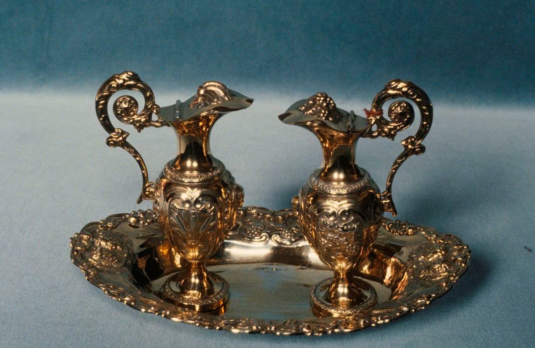 plateau à burettes ; burettes ; boîte et coffret pour le rangement des objets liturgiques