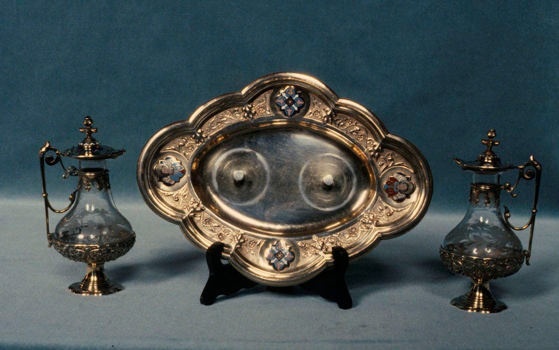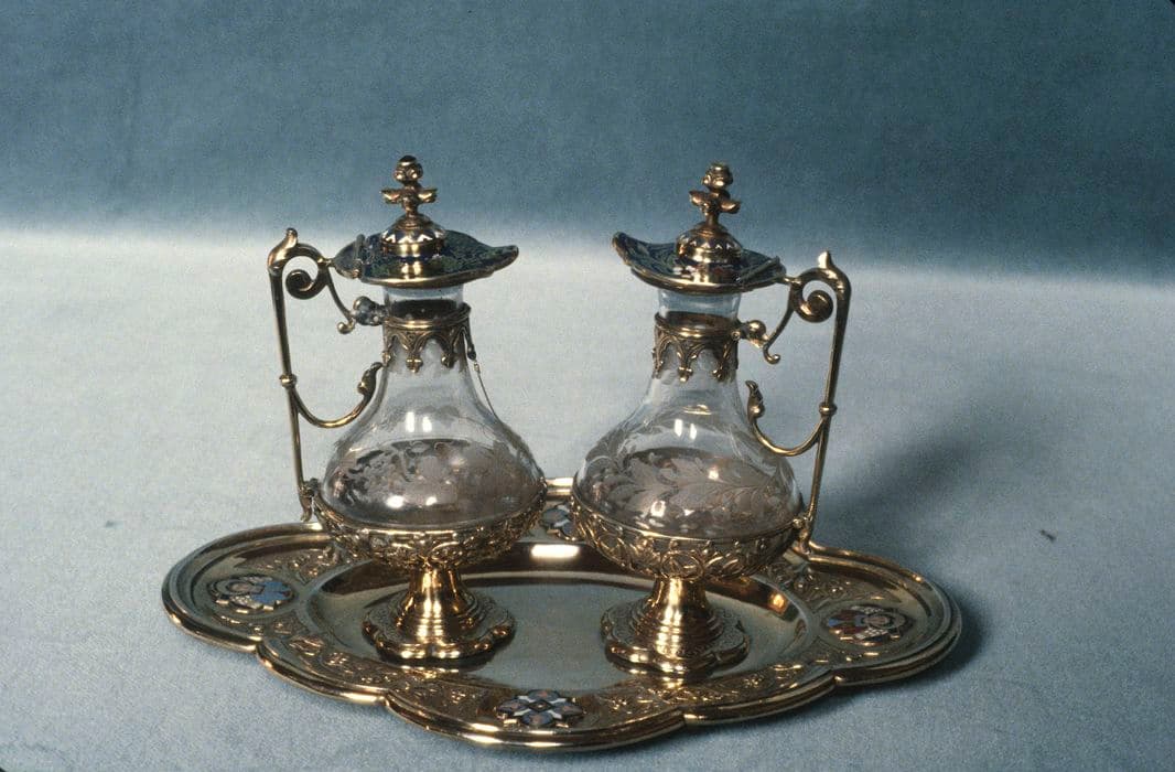 Plateau et burettes en vermeil, verre gravé et émaux.