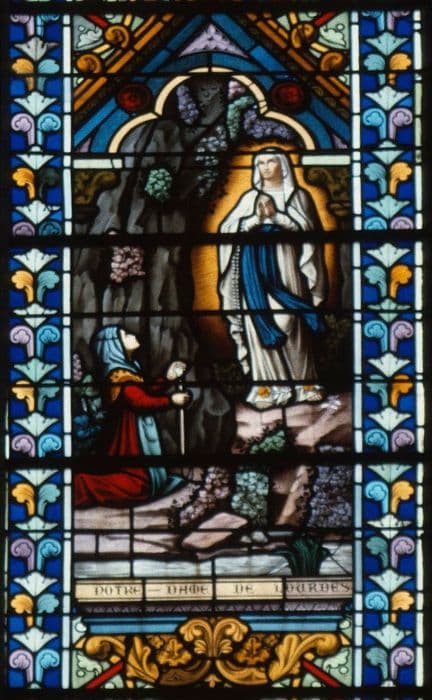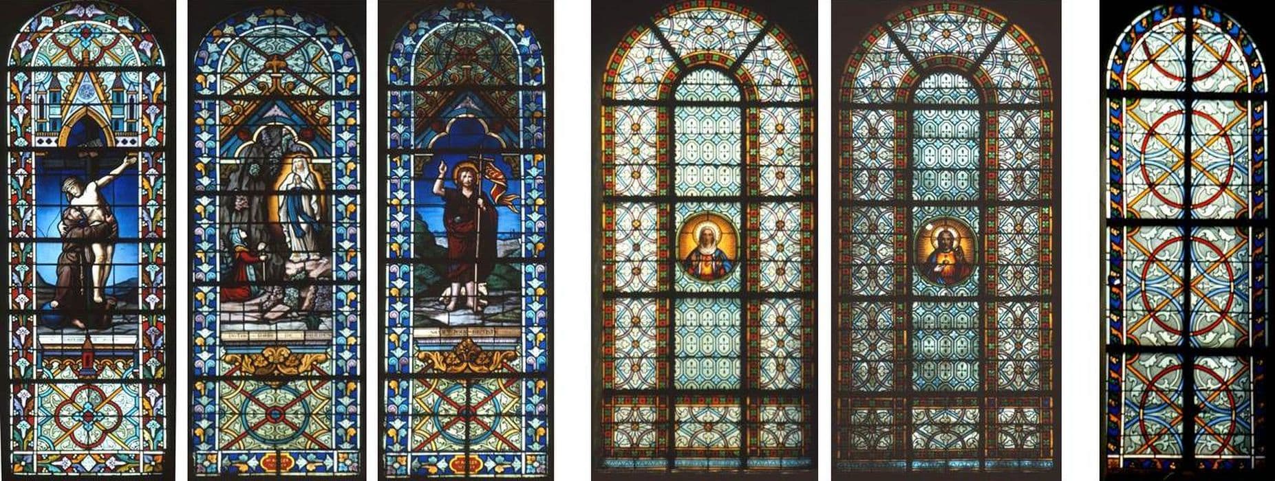 ensemble de neuf verrières (grisailles) et cinq verrières : Saint François d'Assise recevant le corps du Christ (baie 0), Apparition de la Vierge de Lourdes (baie 1), Saint Jean Baptiste (baie 2), Sacré-Coeur de la Vierge (baie 3), Sacré-Coeur de Jésus (baie 4)