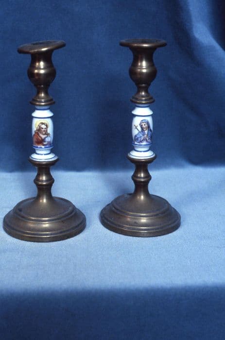 Les bustes de la Vierge et du Christ sont peints sur porcelaine sur le fût des chandeliers.