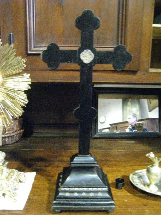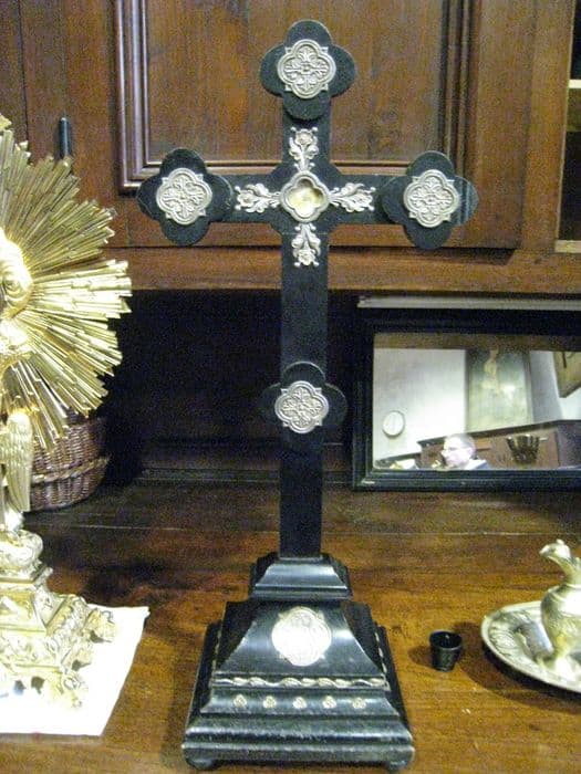 Croix-reliquaire en bois noirci avec application d'argent.