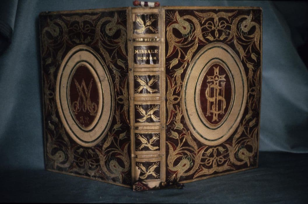 Missel romain à la reliure en cuir, décor doré et mosaïqué.