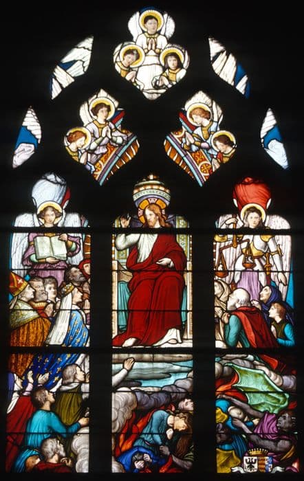 POP | Plateforme ouverte du patrimoinehuit verrières : Cène (baie 1), Calvaire (baie 2), Annonciation (baie 3), Jésus présenté au peuple (baie 6), Christ juge (baie 8), Baptême du Christ (baie 10), Baptême de Clovis (baie 14), Baptême de Constantin (baie 12)