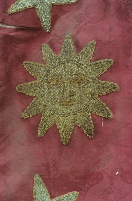 soie : tissu façonné, application sur textile, brodé, polychrome ; fil métal (or)