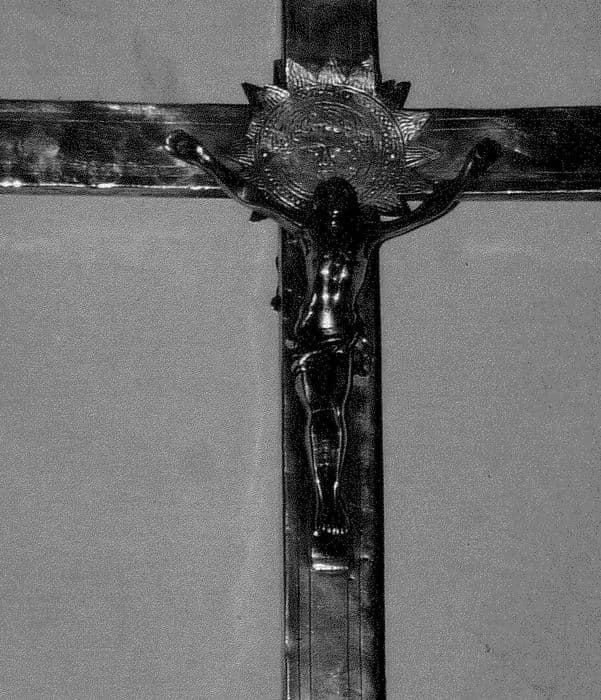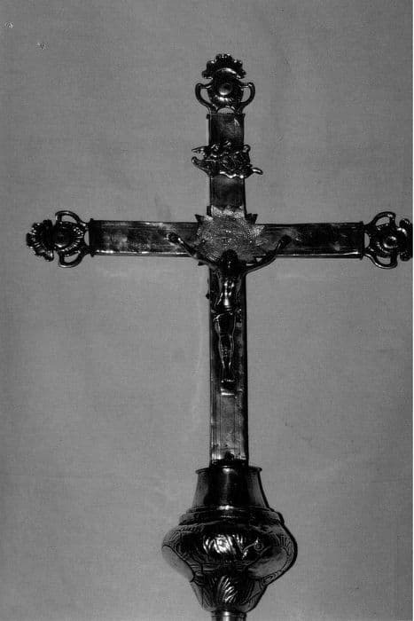 Croix de procession en argent sur une âme de bois et bronze argenté.
