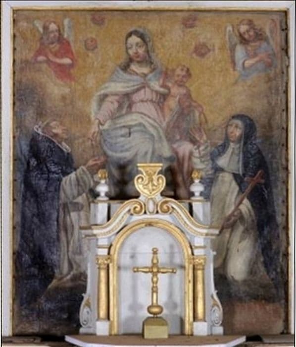 POP | Plateforme ouverte du patrimoineretable, tabernacle, tableau : Don du Rosaire à saint Dominique et à sainte Catherine de Sienne, statue : Christ en croix et peinture monumentale : Calvaire