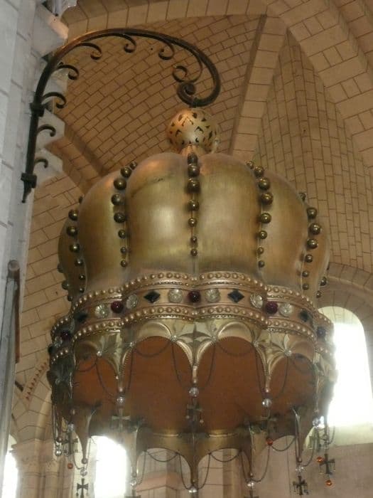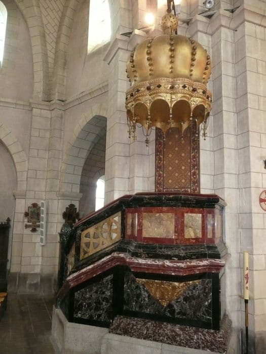 Chaire à prêcher en marbre polychrome, tôle dorée et verroterie (dôme), toile peinte et dorée (dosseret).