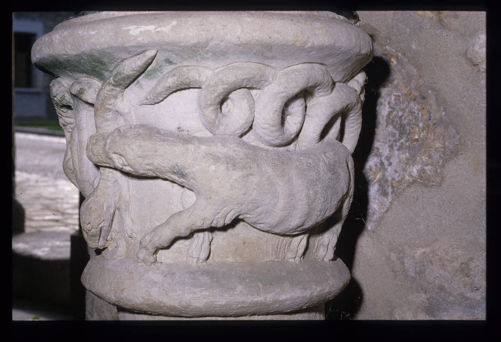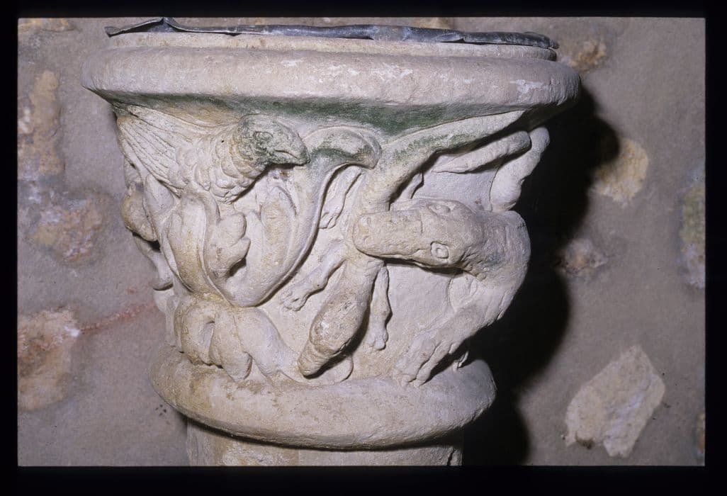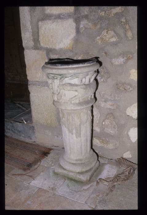 Sur une colonne cannelée est une cuve en forme de chapiteau ornée de moulures et de sculptures avec des animaux fantastiques.
