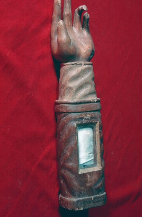 Bras-reliquaire en bois fruitier, dont la main fait un geste de bénédiction.
