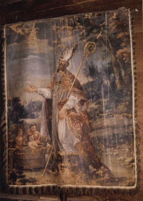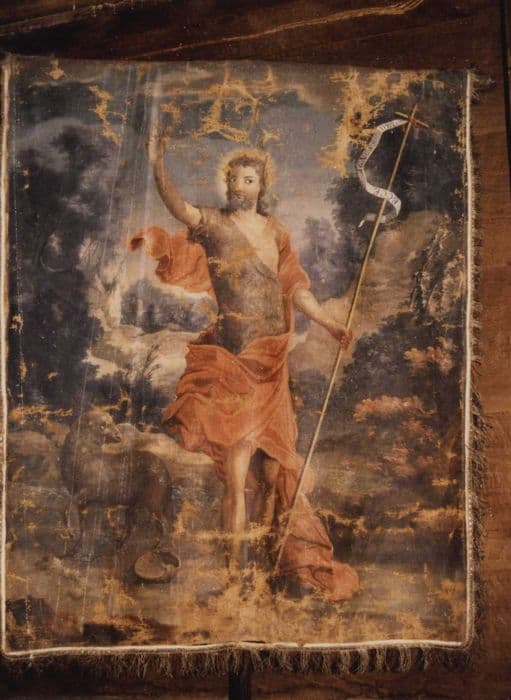 Représentation des saints Jean-Baptiste et Nicolas sur chacune des faces de la bannière.