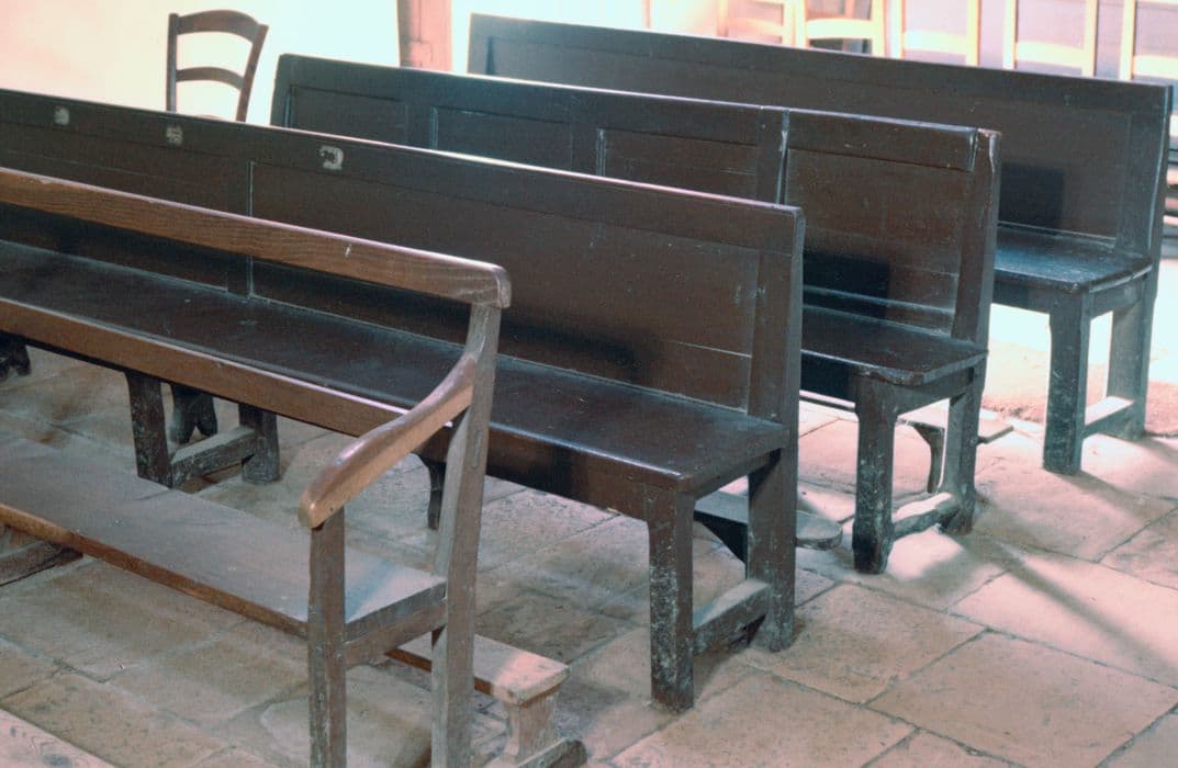Deux ensembles de vingt-trois bancs de diverses longueurs : l'ensemble situé à gauche en entrant (quinze bancs) est composé de bancs plus hauts que l'autre.