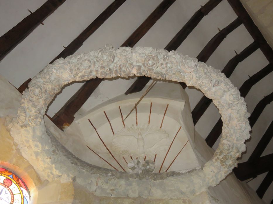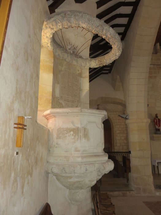 La chaire est soutenue par un cul-de-lampe sur le quel figure un aigle. Le baldaquin est remplacé par une couronne de pierre sculptée de feuillages et de marguerites rappelant la donatrice, Marguerite Orfray.