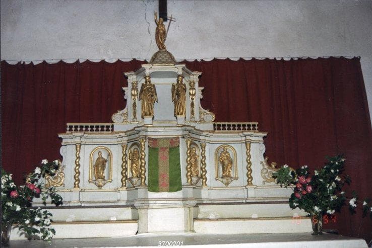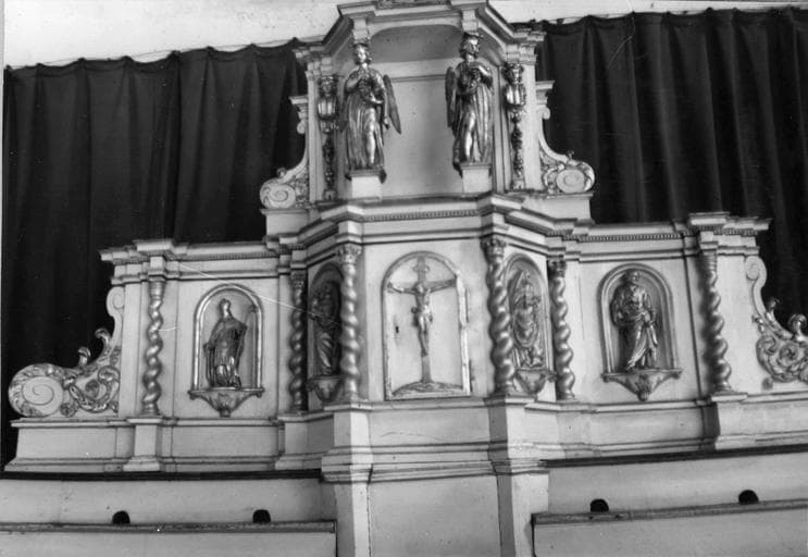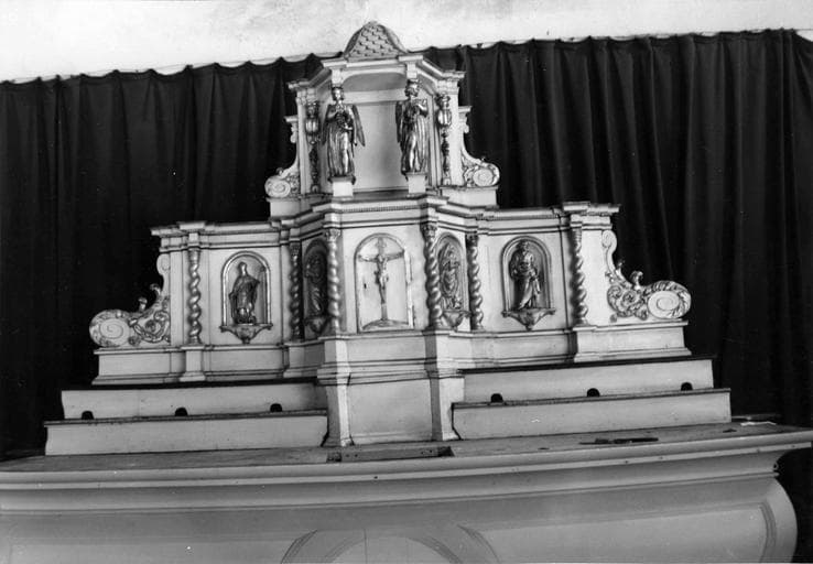 Au centre deux statuettes d'anges porte-couronne supportant un petit dôme à écailles. Au sommet, le Christ, à droite et à gauche, saint Pierre et un saint évêque.