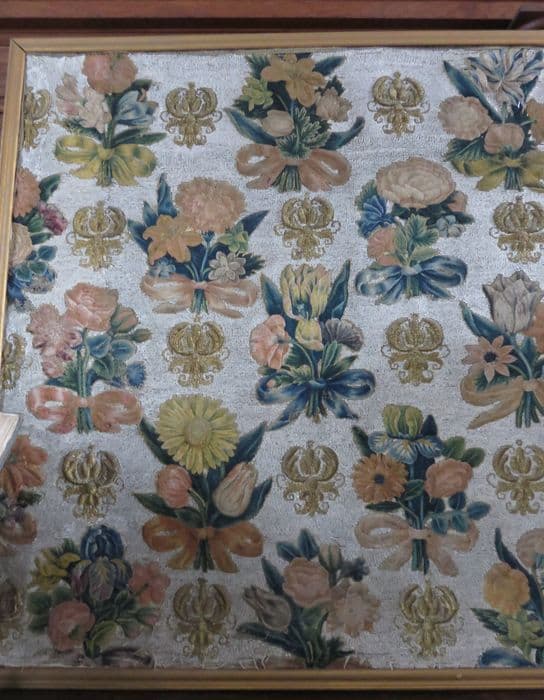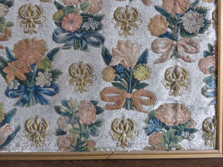 Perles de verre, laine et fil d'or sur toile. Cadre en bois.