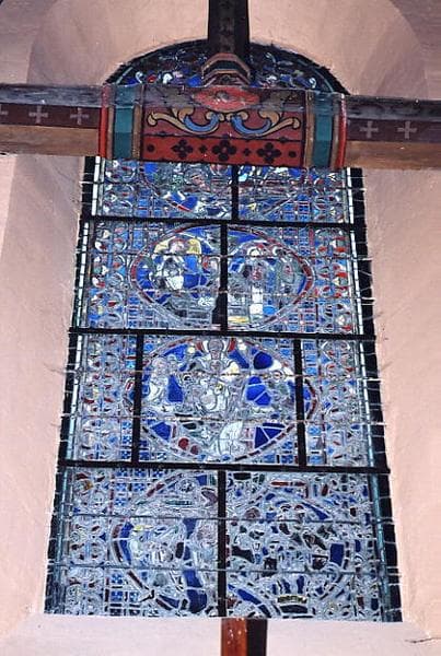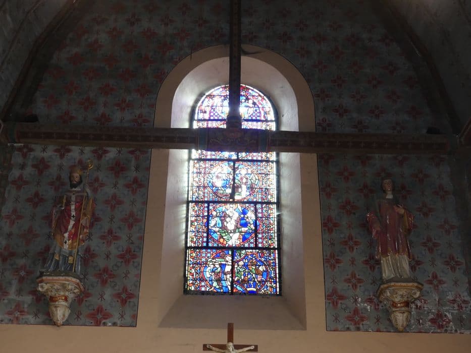 verrière : la Crucifixion, le Triomphe de la Vierge, les Saintes femmes au tombeau, le Martyre de saint Laurent, le Christ bénissant