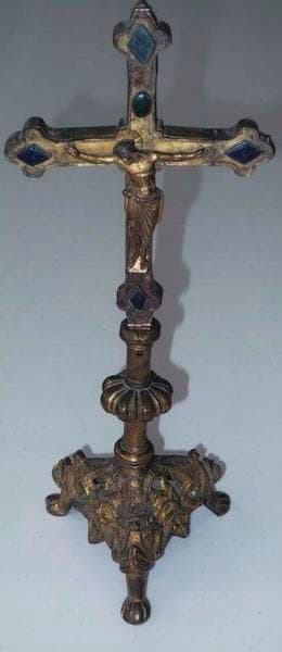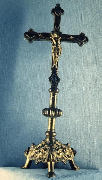 Croix fixée sur un trépied orné de masques et de rinceaux.