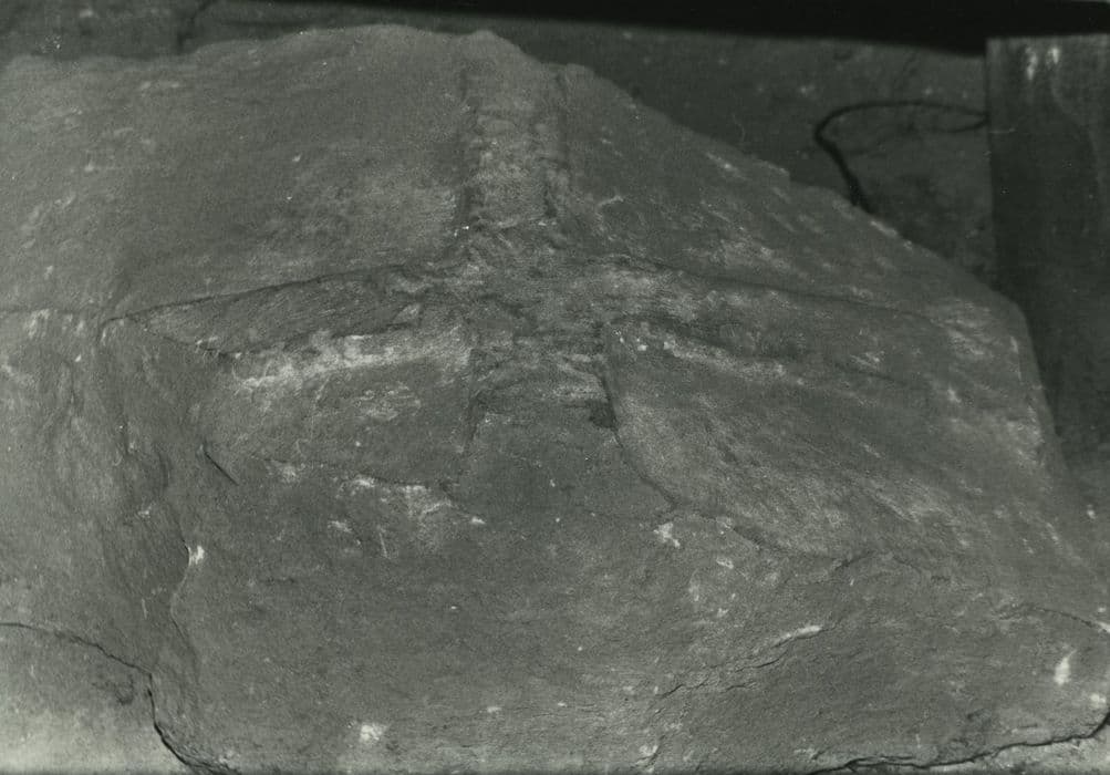 Dalle en pierre noire. Croix pattée sculptée sur le dessus, en relief.
