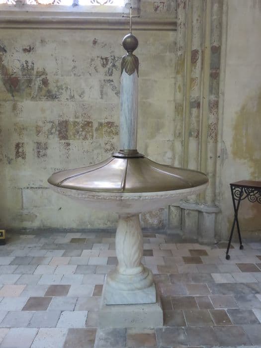 Complément 2017 : fût de colonnette en marbre cipolin gris, veiné de vert et de brun se terminant par un globe et une croix en laiton ; couvercle de huit quartiers en laiton s’articulant sur le piédouche de marbre blanc intercalé entre la vasque et la colonnette.