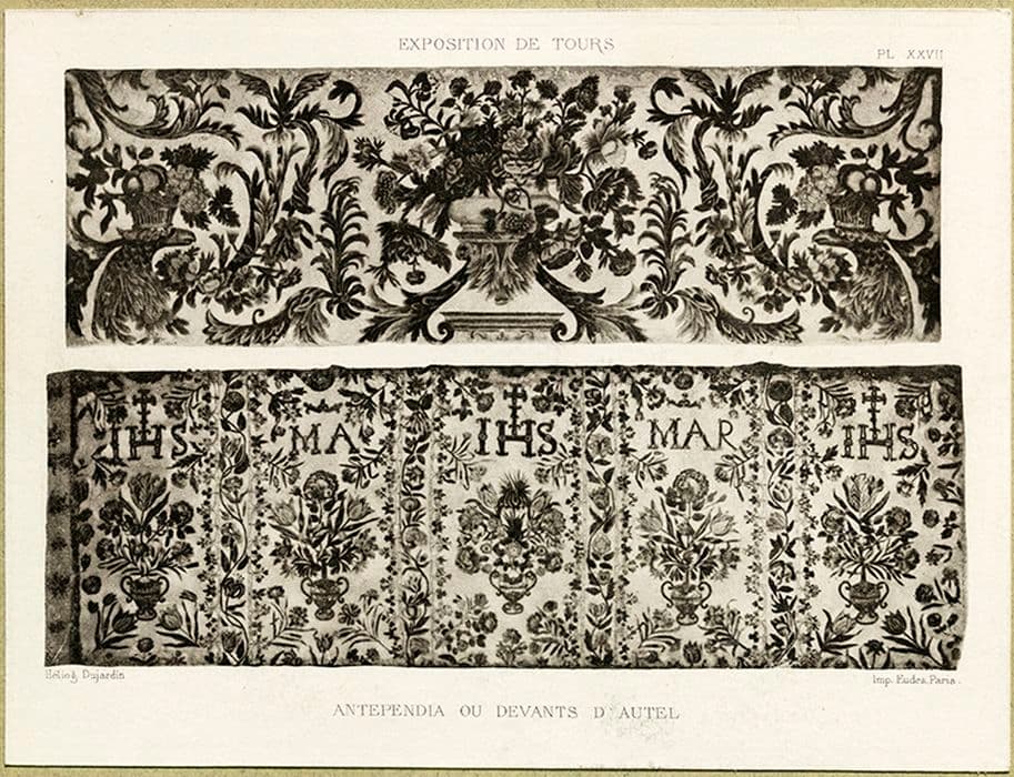 Broderie de soie et fil de métal, sur satin de soie. Fond à paillettes d'argent. Dessins et coloris similaires à ceux de la chasuble et des dalmatiques du couvent du Carmel.