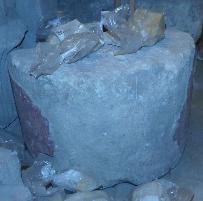 Fragment de demi-colonne en pierre blanche ayant gardé son enduit peint rouge et blanc imitant le marbre. Motifs végétaux peints sur fond rouge.