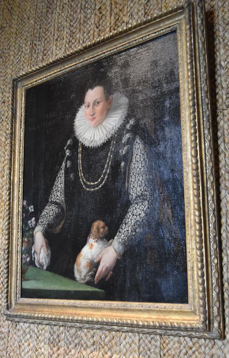 Portrait de femme, vue de trois quarts gauche, vêtue d'une robe noire brodée de noir aux manches noires et blanches, portant une large fraise blanche et un collier à deux rangs, elle tient un chien sur ses genoux ; à sa droite, une table avec un vase de fleurs