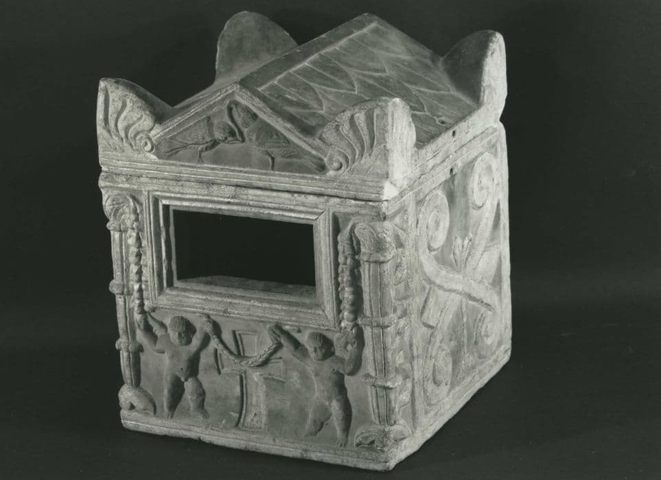 Reliquaire en marbre blanc et doré sculpté. (Source CMN 2024). Décor en bas-relief.