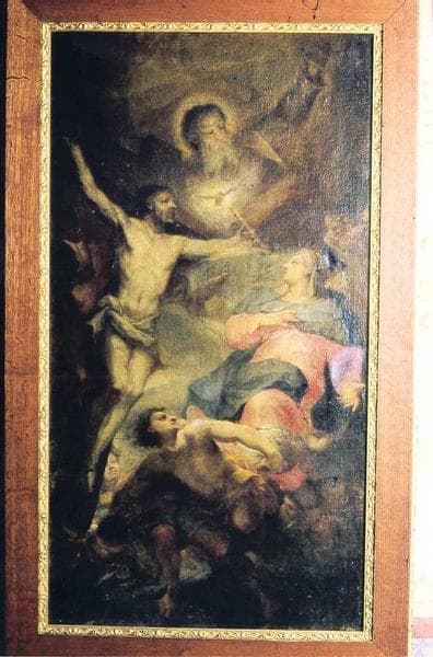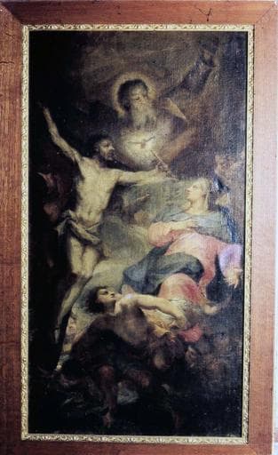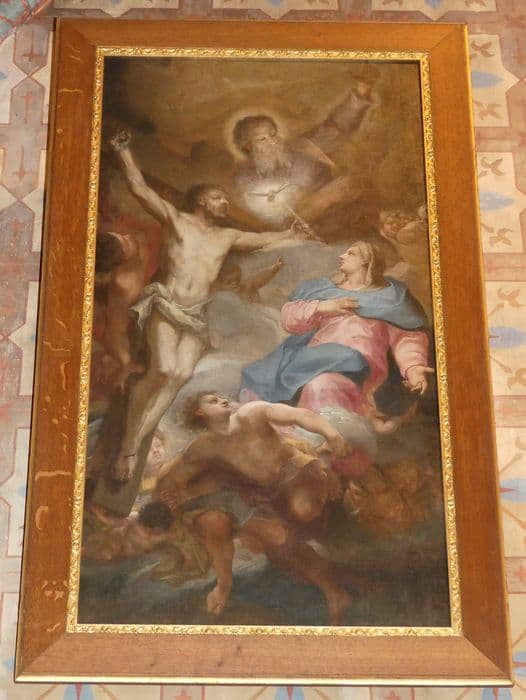 tableau : La Vierge Marie, élevée au Ciel, accueillie par la Sainte Trinité, cadre