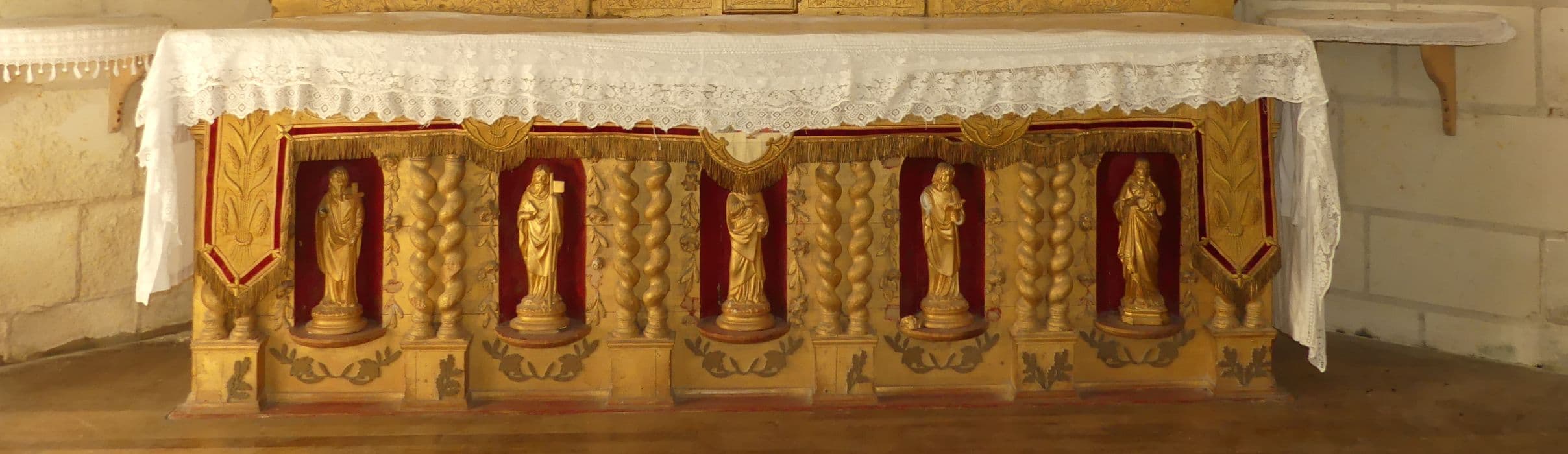 L'autel est composé de cinq travées séparées par des colonnes torses jumelles sur base commune. Chaque travée est creusée d'une niche entourée d'une ornementation végétale sculptée en bas-relief.