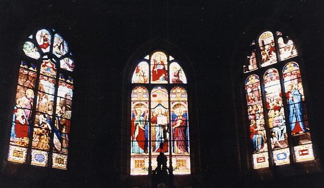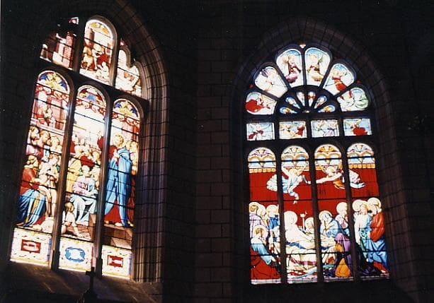 verre translucide (coloré) : peint, grisaille sur verre, jaune d'argent ; plomb (réseau)
