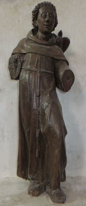 Saint François d'Assise est debout en habit franciscain, la jambe gauche légèrement fléchie. Un oiseau se tient sur son épaule gauche.