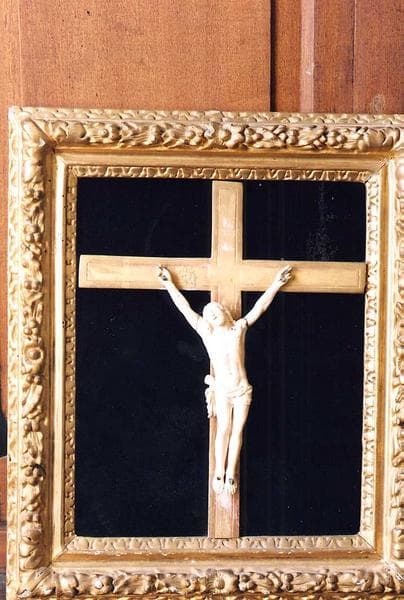 Christ en croix en ivoire cloué sur une croix en bois, elle-même fixée sur un tissu de velours noir tendu dans un cadre rectangulaire cintré dans sa partie supérieure et entièrement doré à la feuille. Le Christ est constitué de 3 éléments : le corps et la tête sont s'une seule pièce, les deux bras ont été travaillés séparément puis assemblés.