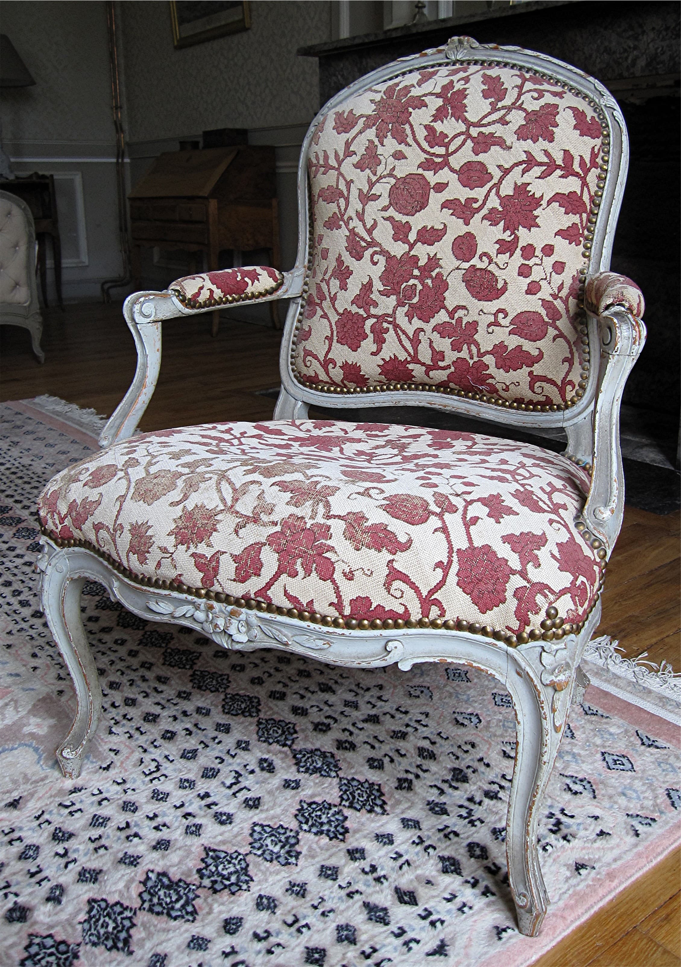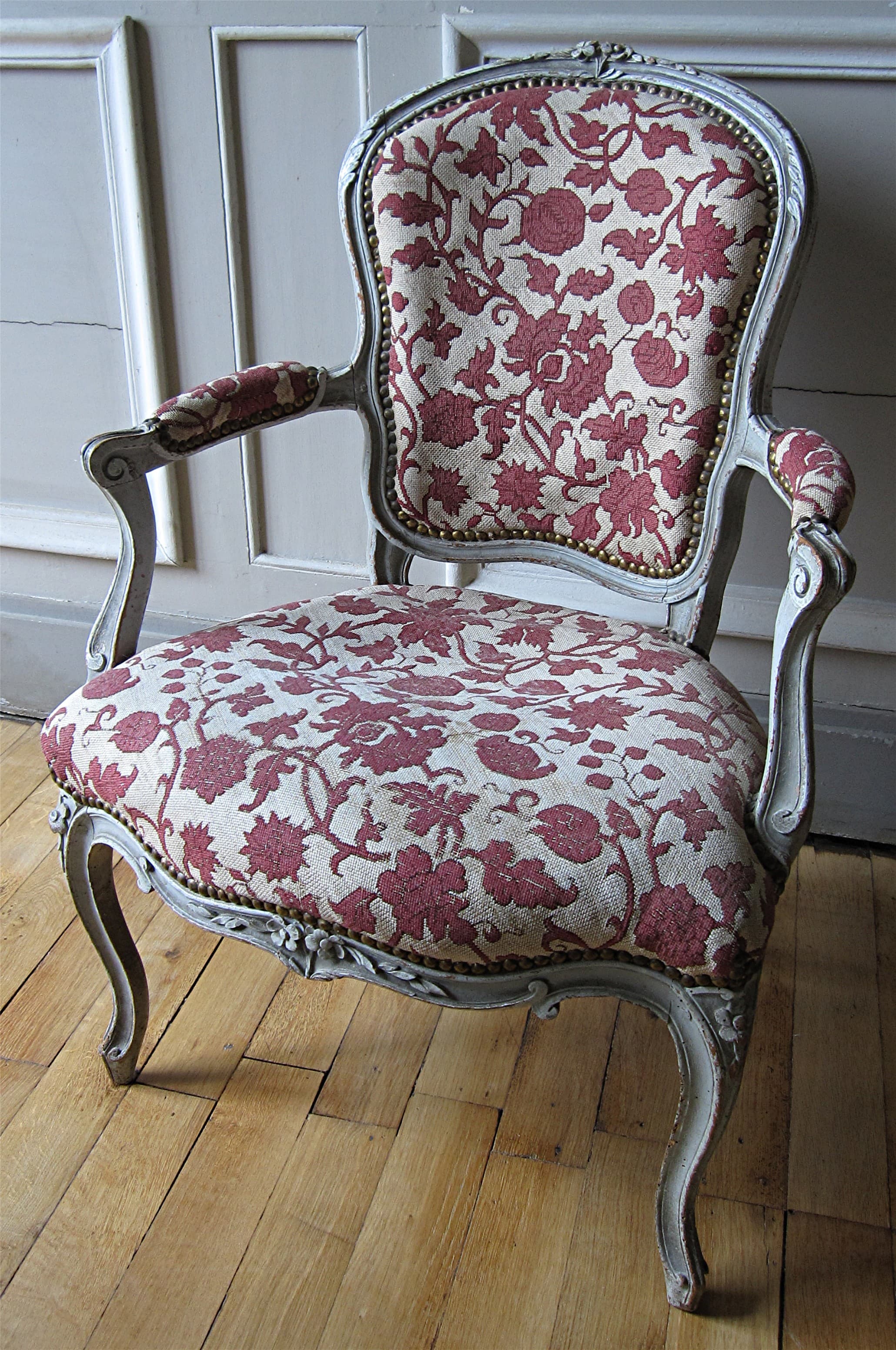 bois : taillé, peint ; textile (garniture) : tapisserie au point