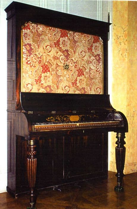 Piano cabinet. Meuble bien conservé mais il manque le fronton du couronnement. Le drapé en soie rayonnant a été remplacé par une tapisserie à fleurs.