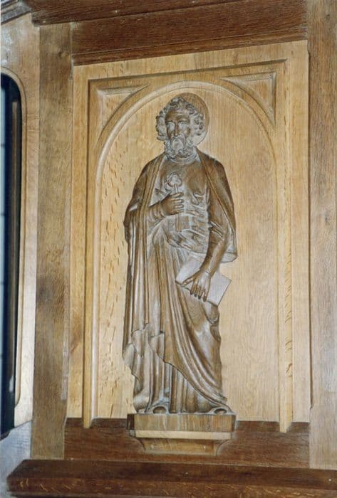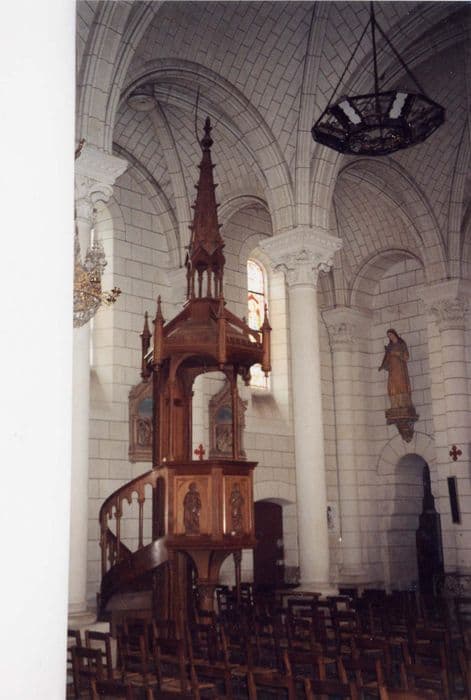 Chaire en bois sculpté. La cuve est divisée en trois arcades, portant les représentations du Sacré-Coeur, de saint Paul et de saint Pierre