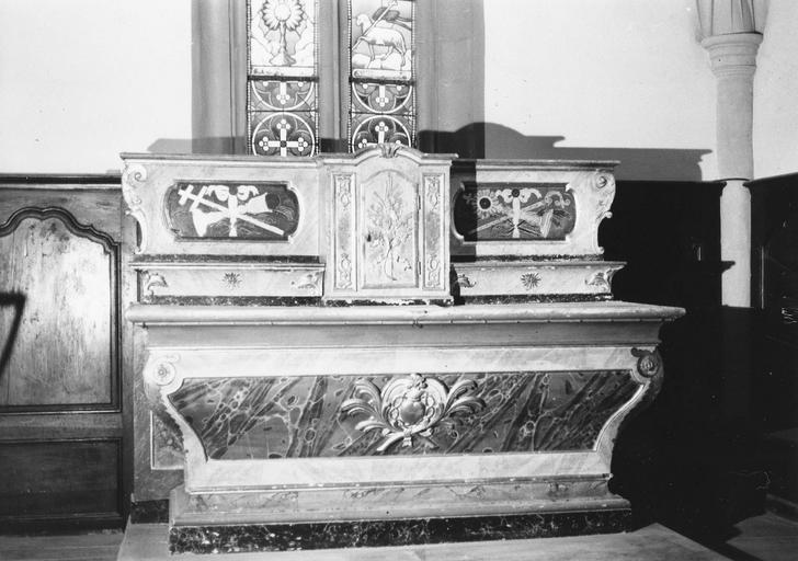 Sur un degré, autel en tombeau d'élévation en doucine, surmonté de deux gradins encadrant le tabernacle à corniche cintré. L'ensemble est en bois peint en faux-marbre et doré.