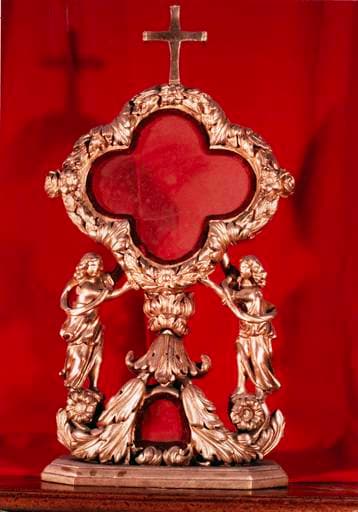 Sur une petite base moulurée deux enroulements feuillagés, s'achevant en marguerite, encadrent un premier reliquaire et soutiennent deux anges ailés.