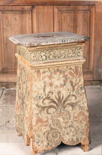Les quatre montants sont recouverts de planchettes à tablier échancré et partie haute ornée d'une moulure soulignant une frise. La tablette de siège moulurée repose sur une corniche à ressauts. La frise est ornée de rinceaux en réserve sur une dominante bleue. La tablette était autrefois peinte.