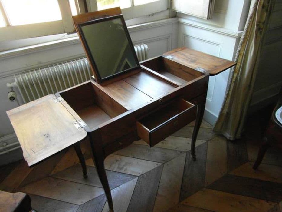 Toilette à dessus brisé, avec bâti en épicéa et placages de noyer, poirier noirci, sapin, cuir, bronze et moire, comportant un miroir à la feuille.