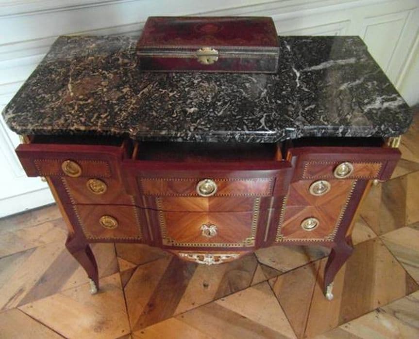 Commode à tiroirs de ceinture, présentant un bâti de chêne, avec amarante, bois de rose, poirier noirci, frêne et marbre noir veiné de blanc.