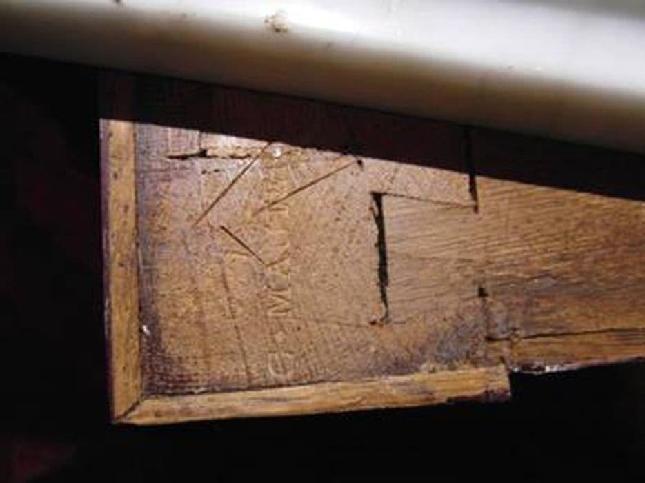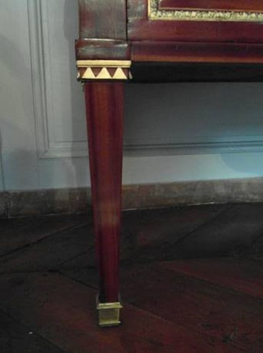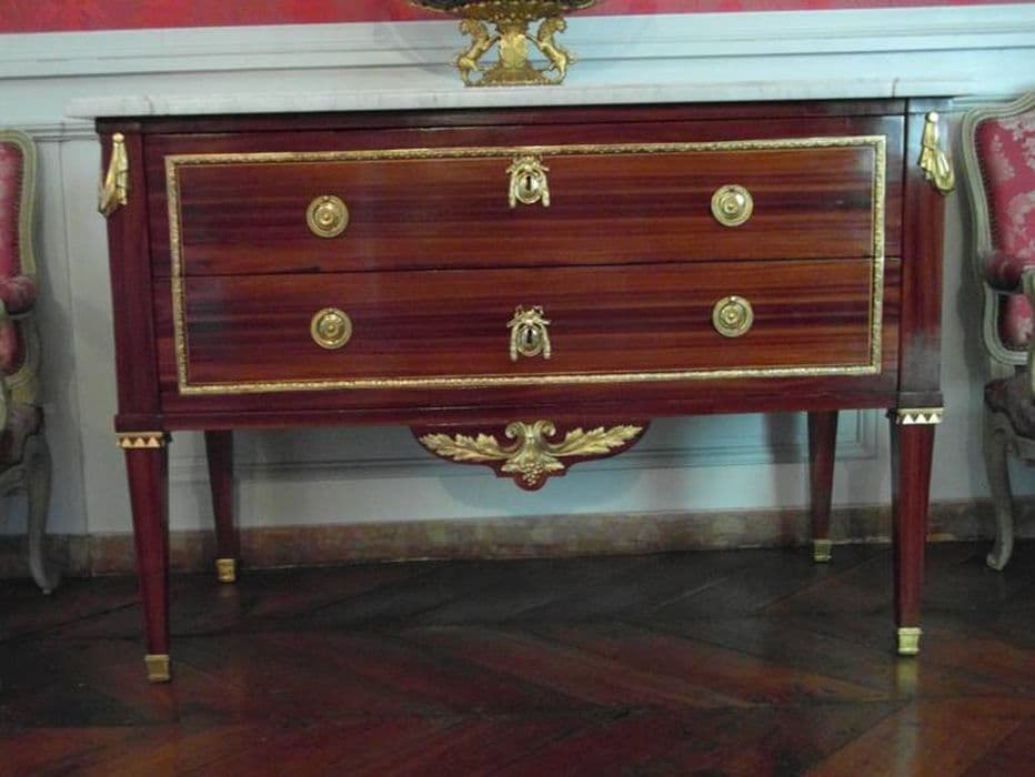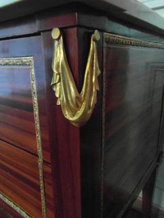 Commode à deux niveaux de tiroirs, en chêne, acajou, bronze et marbre blanc.